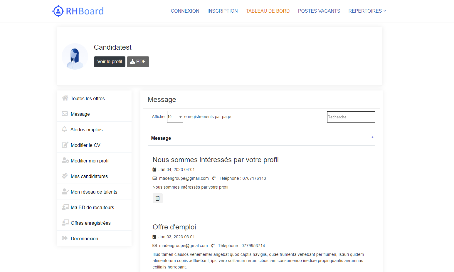 Vue du tableau de bord candidat